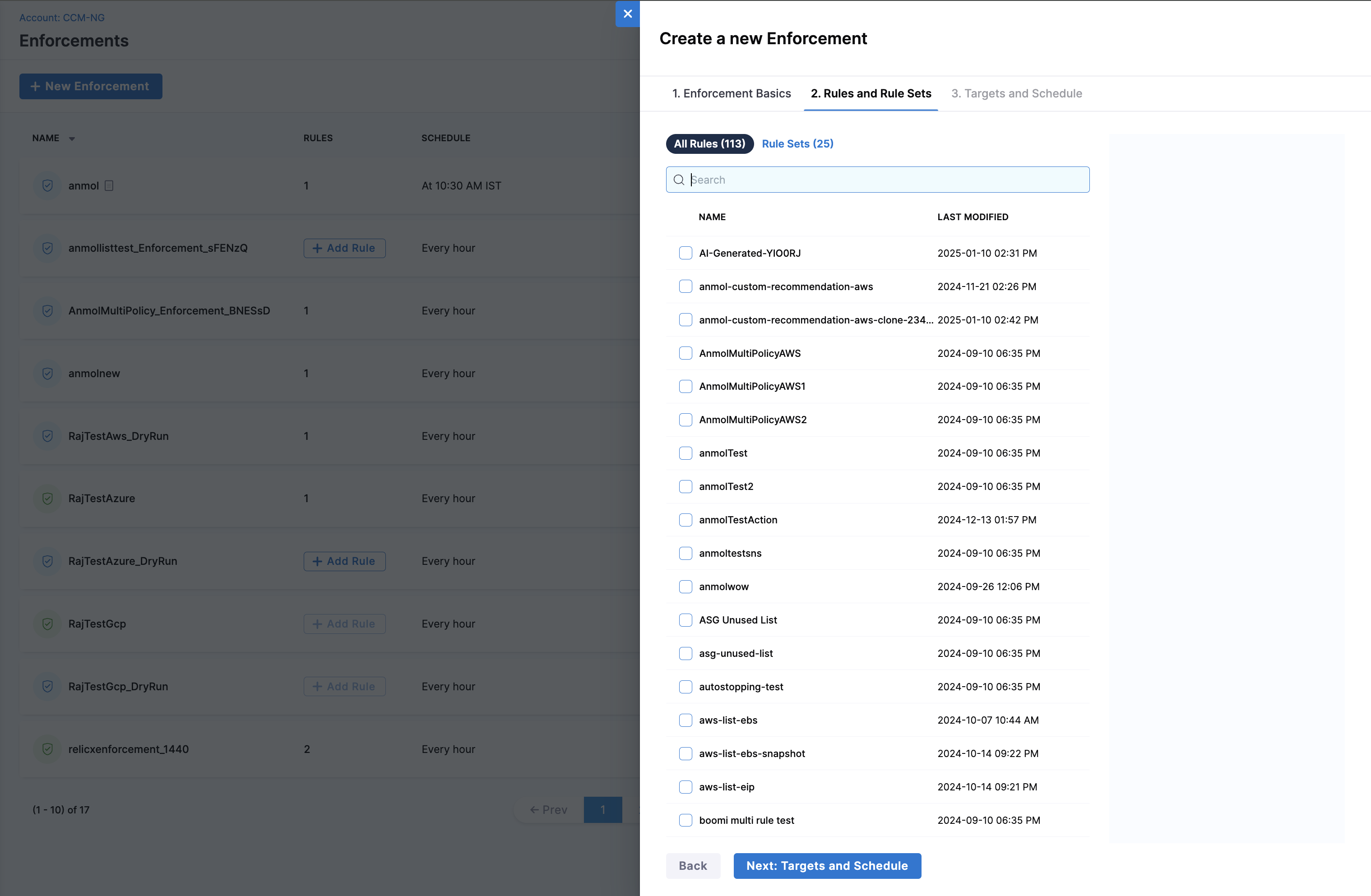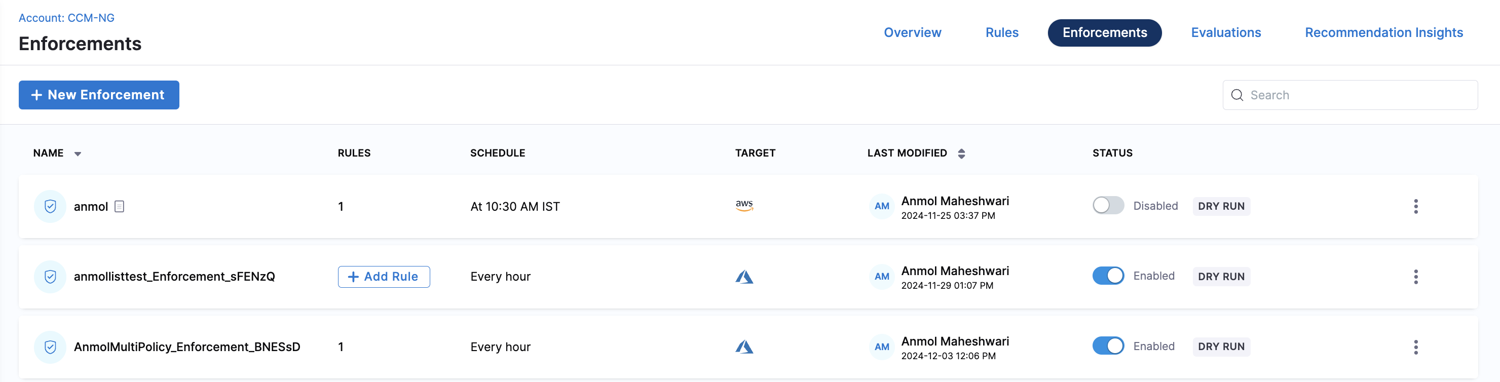 Enforcements enable you to enforce a certain set of Rules or Rule Sets (also known as governance guardrails) against a specific set of targets (accounts, projects, or subscriptions) to run periodically. Sometimes, we need rules to run periodically, such as every day, week, or month. However, running these rules manually every day or week at a specified time creates extra overhead and is a slow process prone to manual errors. To solve this, Enforcements allow users to set up a timely schedule and choose the day, time, and frequency for their rules or rule sets.