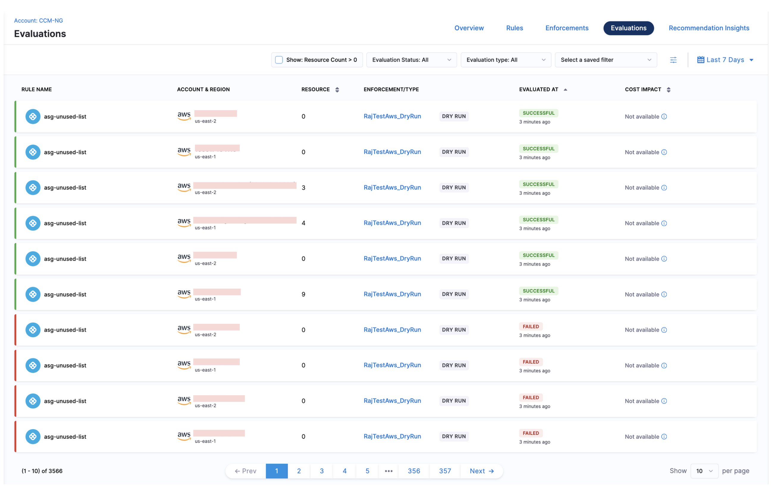 Evaluations include all the data about enforcements run (both RUN ONCE from rule editor and from Enforcement). The Evaluations window also shows you the total cost impact with each Enforcement i.e. the costs or spendings associated with each Evaluation along with the last time that Rule/Rule set was enforced. With Evaluations, you can view and audit all the Enforcements that ran in the past.