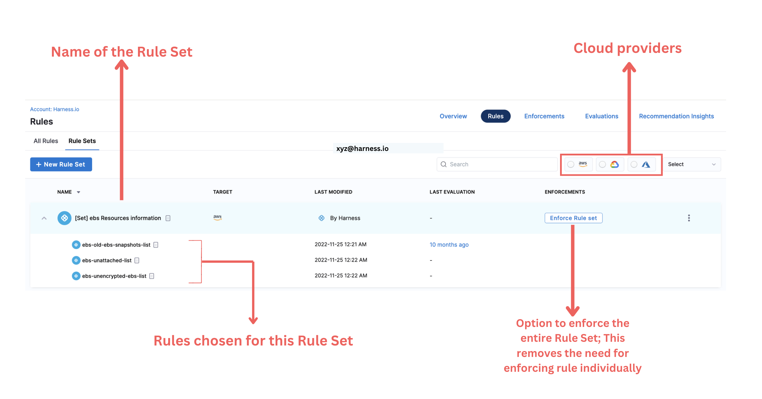 Harness Concepts: Rules, Rule Sets, Enforcements and Evaluations to optimise cloud costs