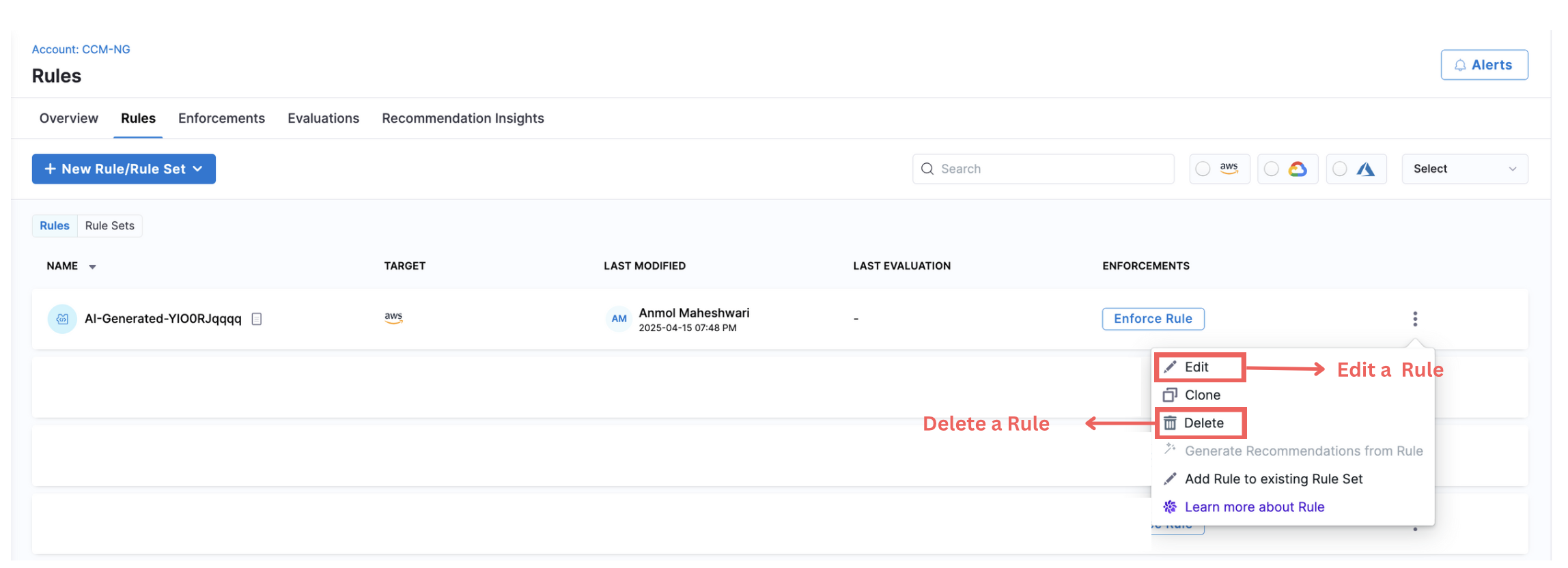 You can view any Enforcements on Rule Enforcements page. Click on the enforcement to view details such as the rules, target accounts, and regions included in the enforcement. For updating, you can use the "Edit" button from the vertical ellipsis menu (⋮) to update the enforcements as per your convenience.