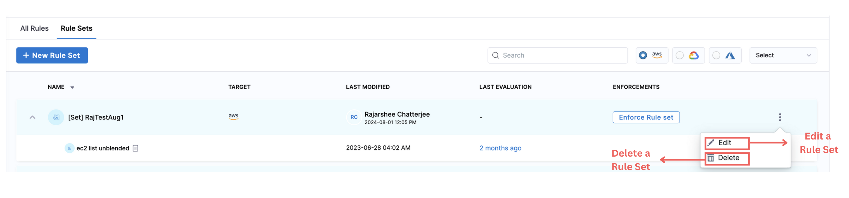 To delete a Rule Set, click on Delete from the vertical ellipsis menu (⋮).