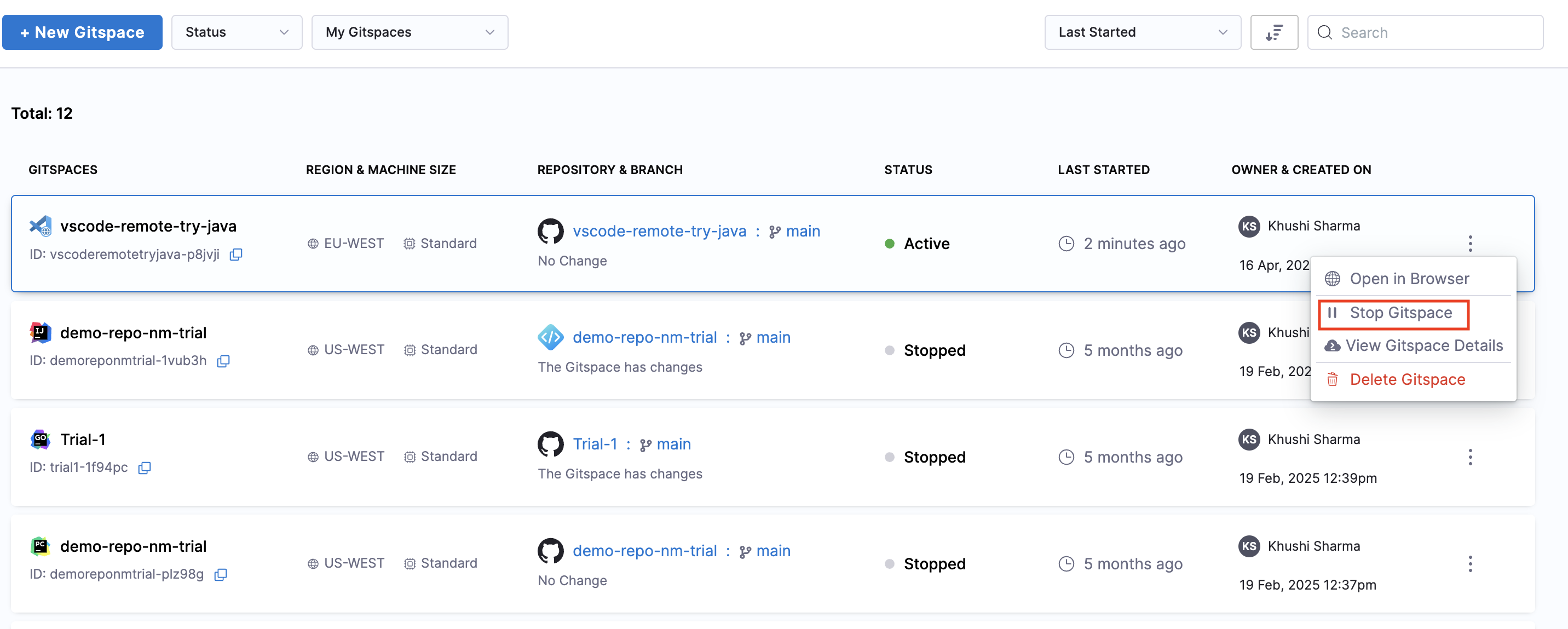 - On the Gitspaces Dashboard, for any active Gitspace, click on the 3 dots menu and select Stop Gitspace.