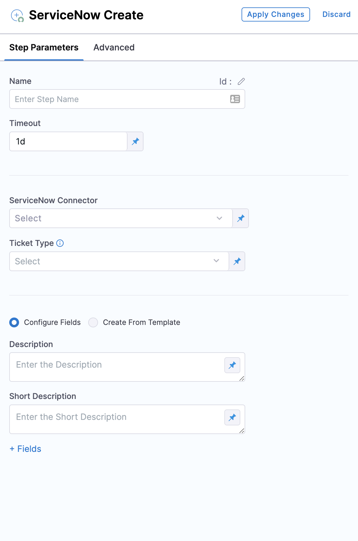 • You must add a Harness ServiceNow connector before or during the Create ServiceNow step setup.