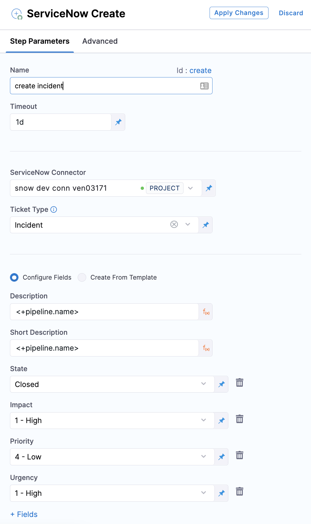 • Automatically create change requests in ServiceNow to track updates to your build, test, and production environments by adding a ServiceNow Create step in your pipeline.