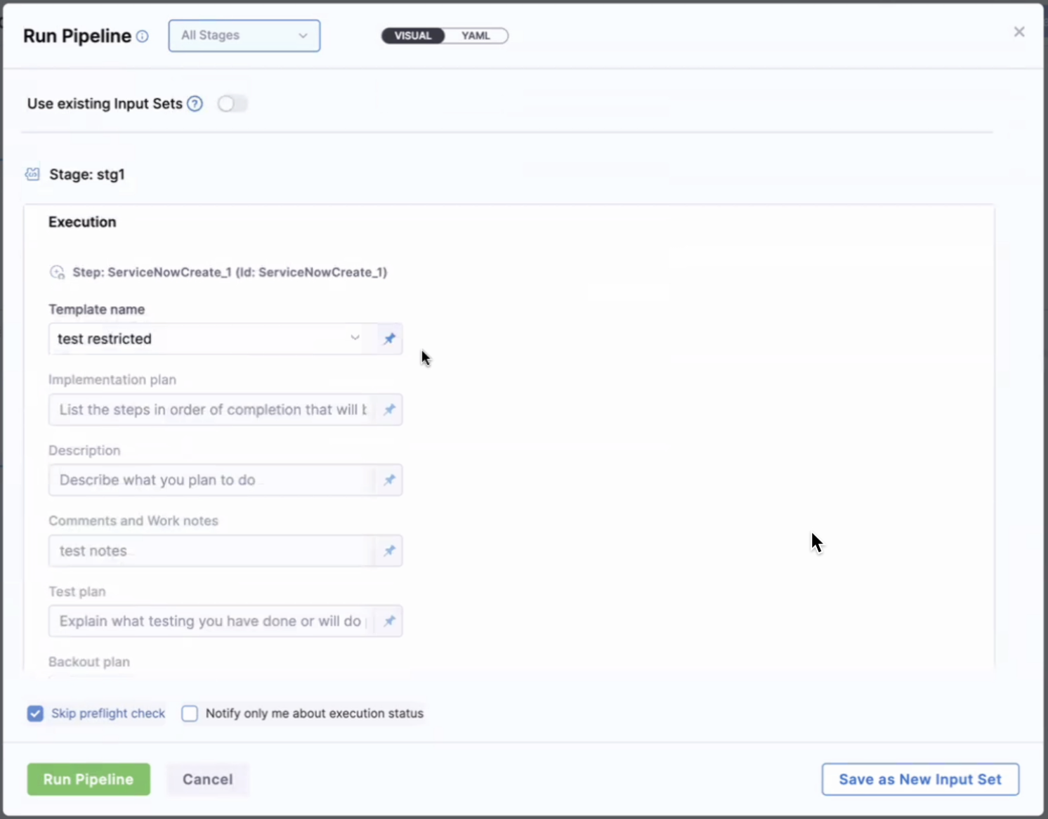 Your ServiceNow ticket is now added to your pipeline. After standard template is loaded, fields are marked editable based on Standard Change Properties if change_manager role is present with the integration user. Else, the properties can't be fetched and fields are made read-only as per default settings in the ServiceNow documentation.