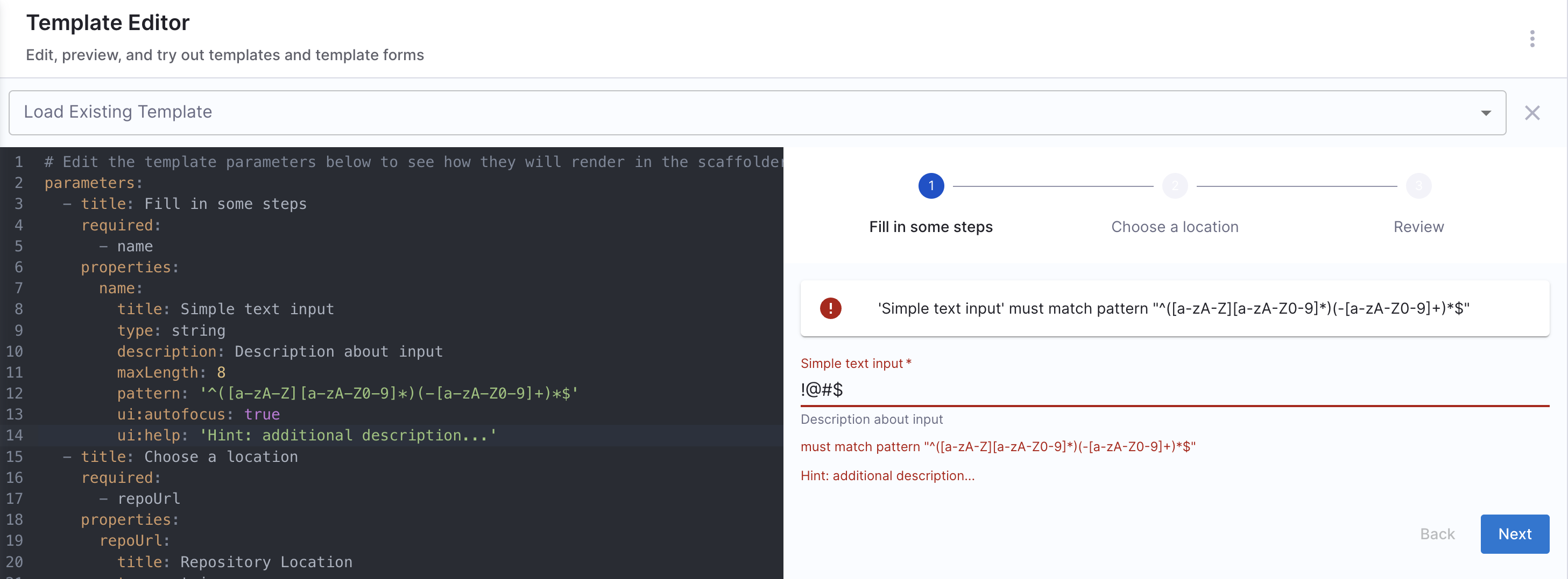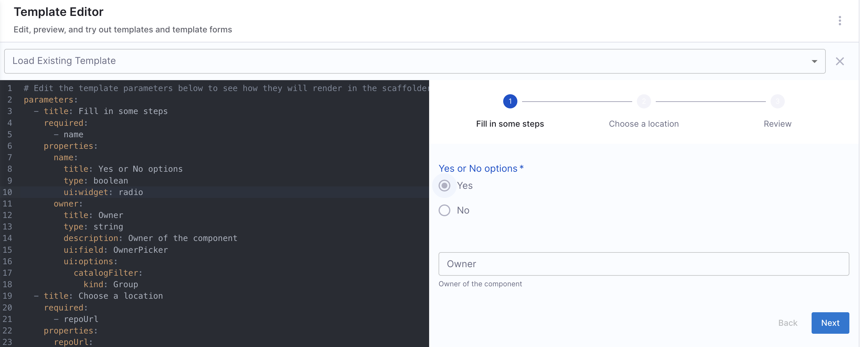Entity Picker– Select an entity from the catalogOwner Picker– Select a user or groupRepository Picker– Choose a repository from a version control provider