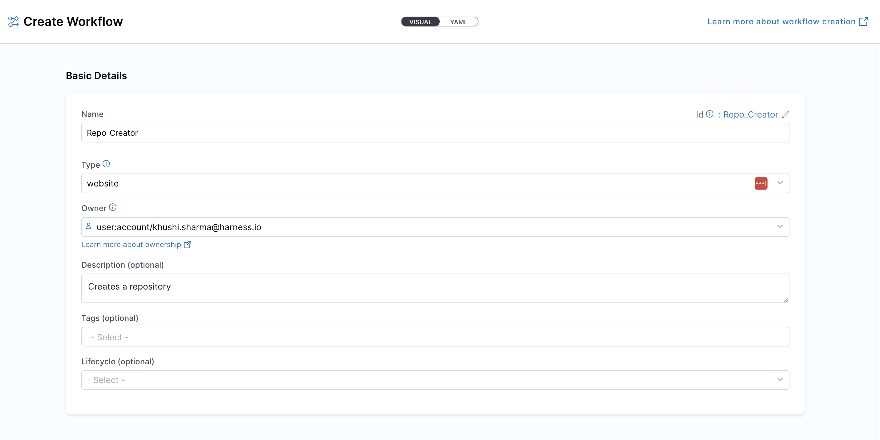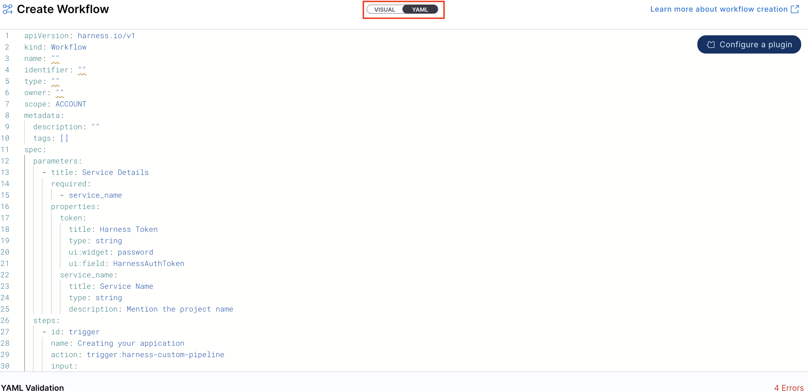 2. Enter the required Workflow information. The Visual view is synced in real-time with the YAML view for full transparency.