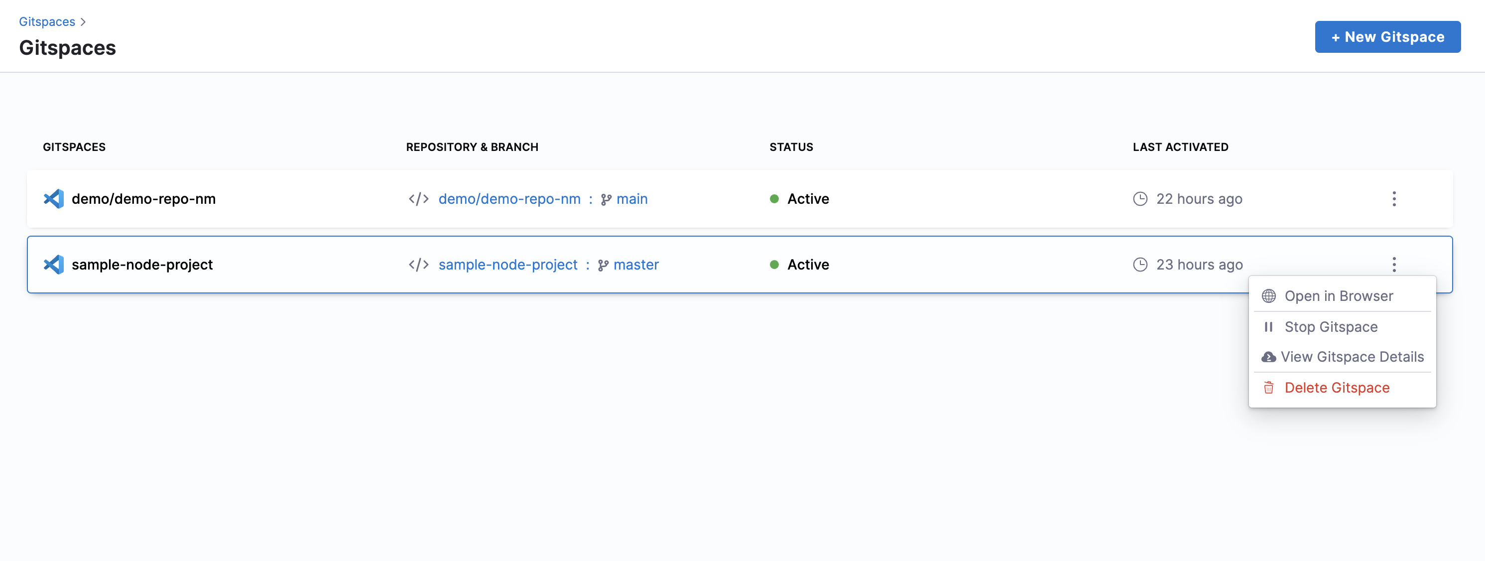 1. On the Gitspace Page click on the 3 dots and select Stop Gitspace.