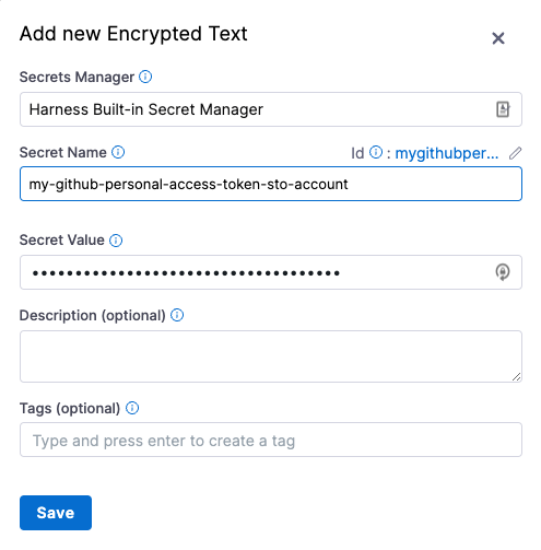 Specify the Secret Name and Secret Value (your GitHub access token). It's good practice to indicate the scope of the secret in the name, as shown in this example.