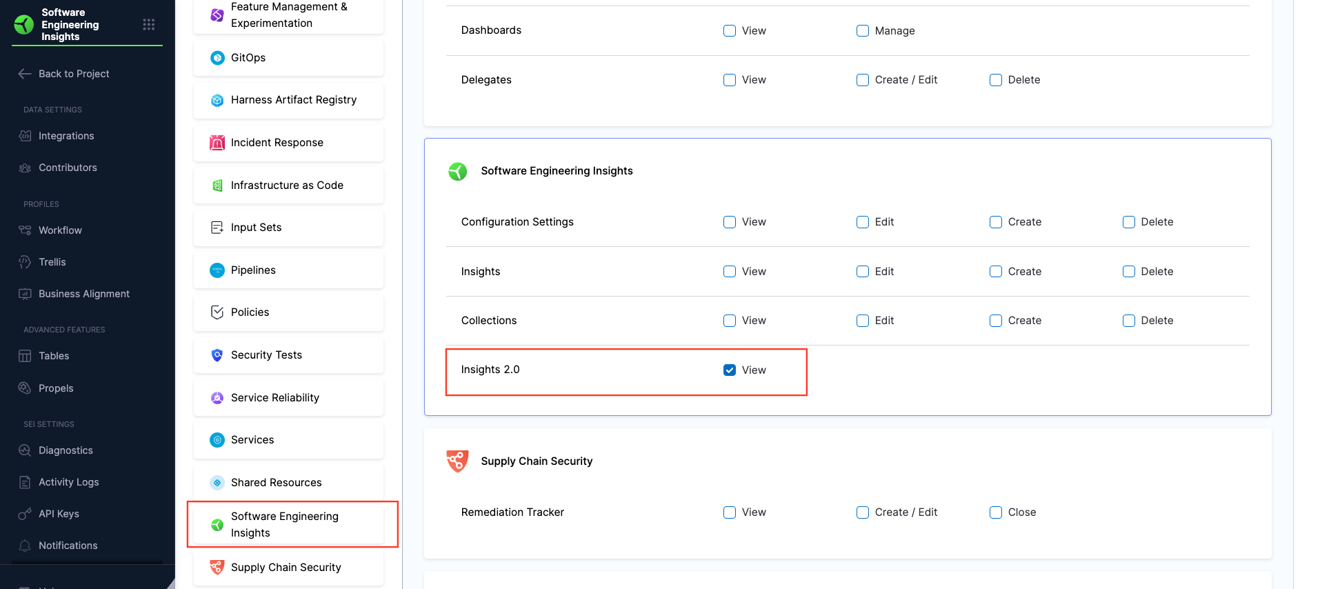 • Select the tab, check the box for Insights 2.0, and grant the View permission.