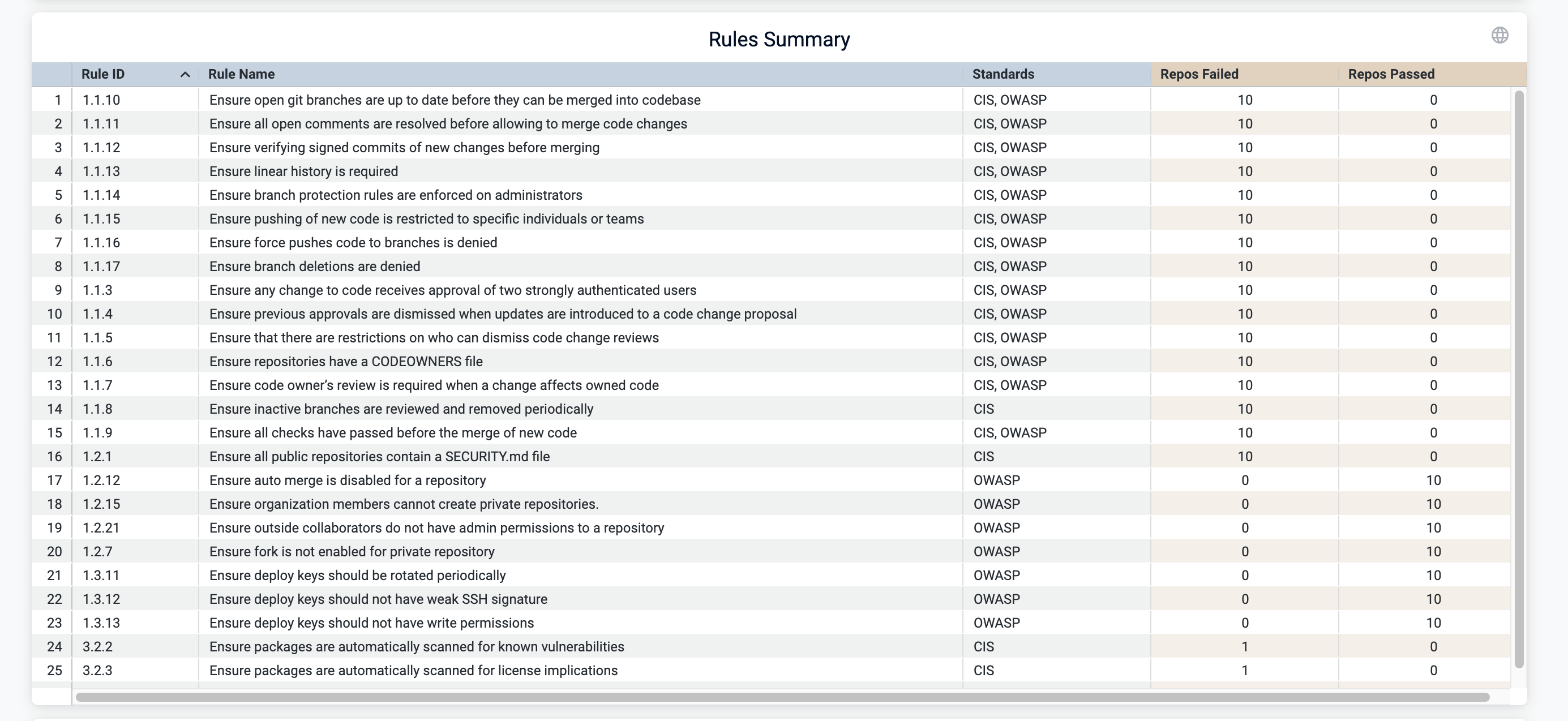 Provides a breakdown of all evaluated compliance rules, showing the number of repositories that passed or failed each rule which helps to pinpoint compliance gaps across standards like CIS and OWASP.
