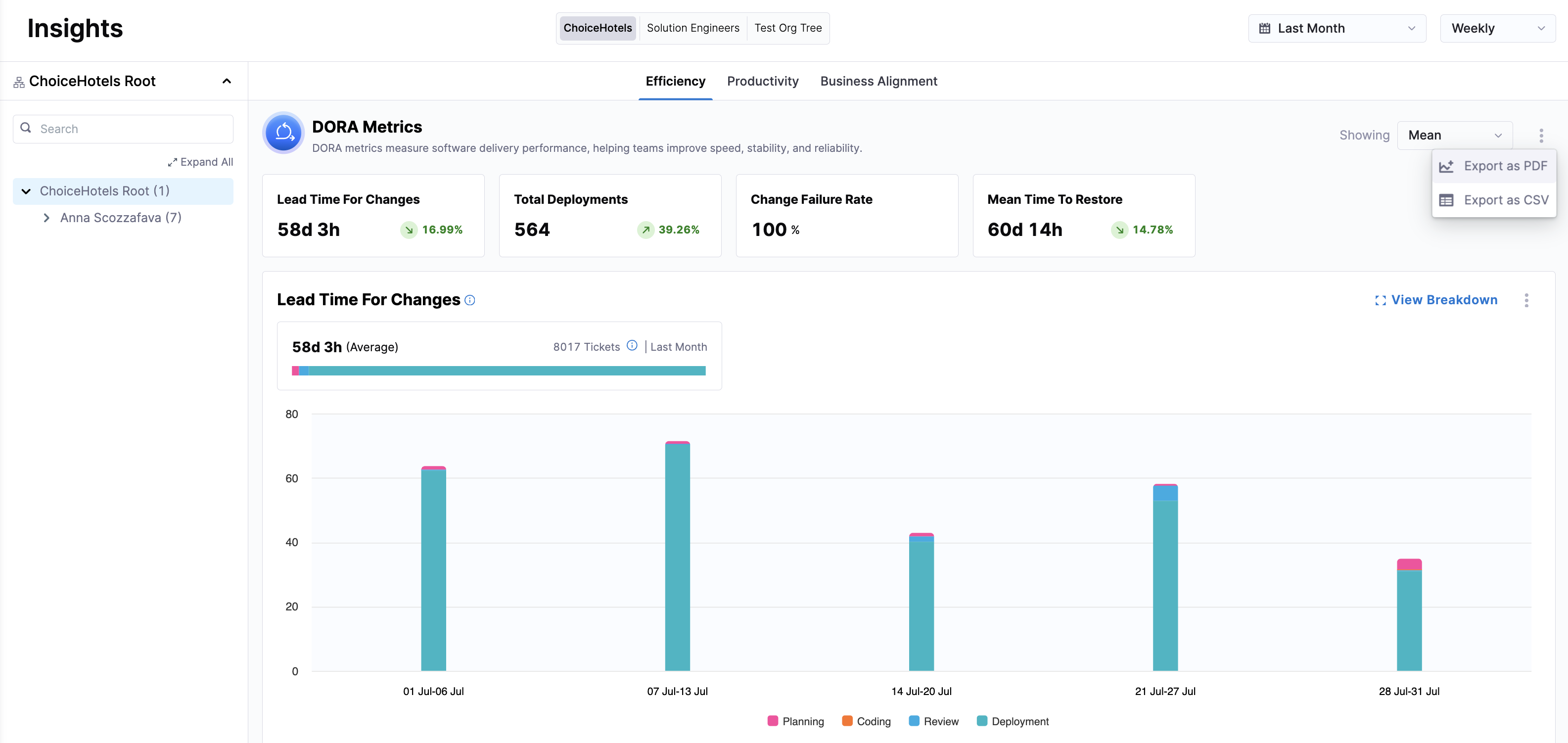 SEI 2.0 introduces a re-imagined engineering insights experience with near real-time access to efficiency, productivity, and business alignment metrics. Built on a modern, high-performance architecture, SEI 2.0 features enable automated developer and organization management, decentralized team administration, and data drill-down options to help organizations scale with ease.